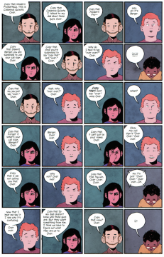 It is also a beautiful thing to look at with Boss’ art style evoking the great David Aja run on Hawkeye with its super stylised and very designed look. It also reminded us of the brilliant David Mazuchelli’s works on Batman Year One – so a couple of very high bars to match. If you were harsh you would say it is horribly derivative as it is an almost carbon copy of Aja’s unique style. But if, like us, you are a huge fan of Aja’s work, then Boss manages to do that rare thing, where homage becomes so accomplished that it equals the source material. Certainly his use of densely panelled pages (for example when they are talking via CB – see left) or intricately conceived pieces of graphic design (such as when Paige hacks her uncles computer in the police station – see right) makes it into something very special and the muted colours and slick chapter pages also helps to give the book a throwback 80s vibe that perfectly matches the tone of the book. (We also loved how each chapter begins with the kids in some form of video game or D&D adventure).