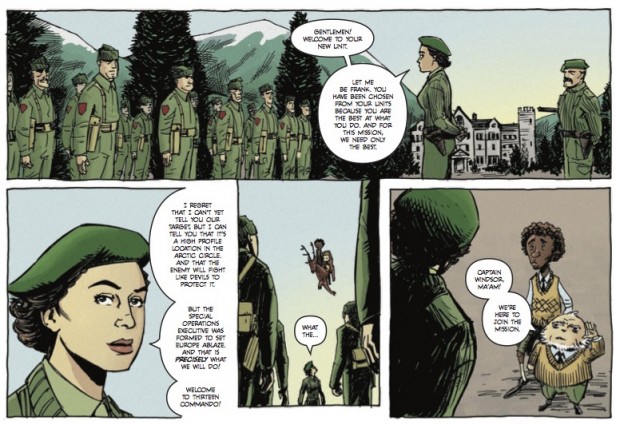 But to answer your question, it was a light-bulb moment that again made me giggle. I loved the idea of taking a royal family member and making her the physical embodiment of Britain’s self image during the war (an iron-cast determination, with a stiff upper-lip). It’s a very positive portrayal I think. The book (and Captain Windsor’s portrayal in particular) draws a lot from the kind of British war movies that were made from the 40s to the 60s, but I was definitely also referencing British war comics – particularly those told in 3 page chapters, as that was the Aces Weekly format. In fact I asked Pat Mills for advice on it, and he was generous enough to pass on some tips.