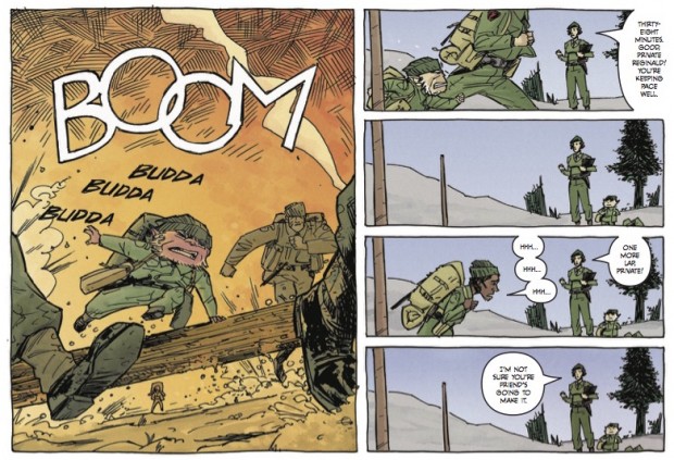 GM: When it came to the layout of the art I had already started in the standard comic book format but luckily I was only a page and a half completed when the opportunity to get published in Aces came. I can’t remember if there were any particular challenges to the format (maybe I’m repressing those memories) but it really offered itself to show off big, sweeping landscapes and I was happy to give it a go. Also I was super chuffed to be able to work with David Lloyd, so if the format was interpretive dance I’d have probably gone for that too.